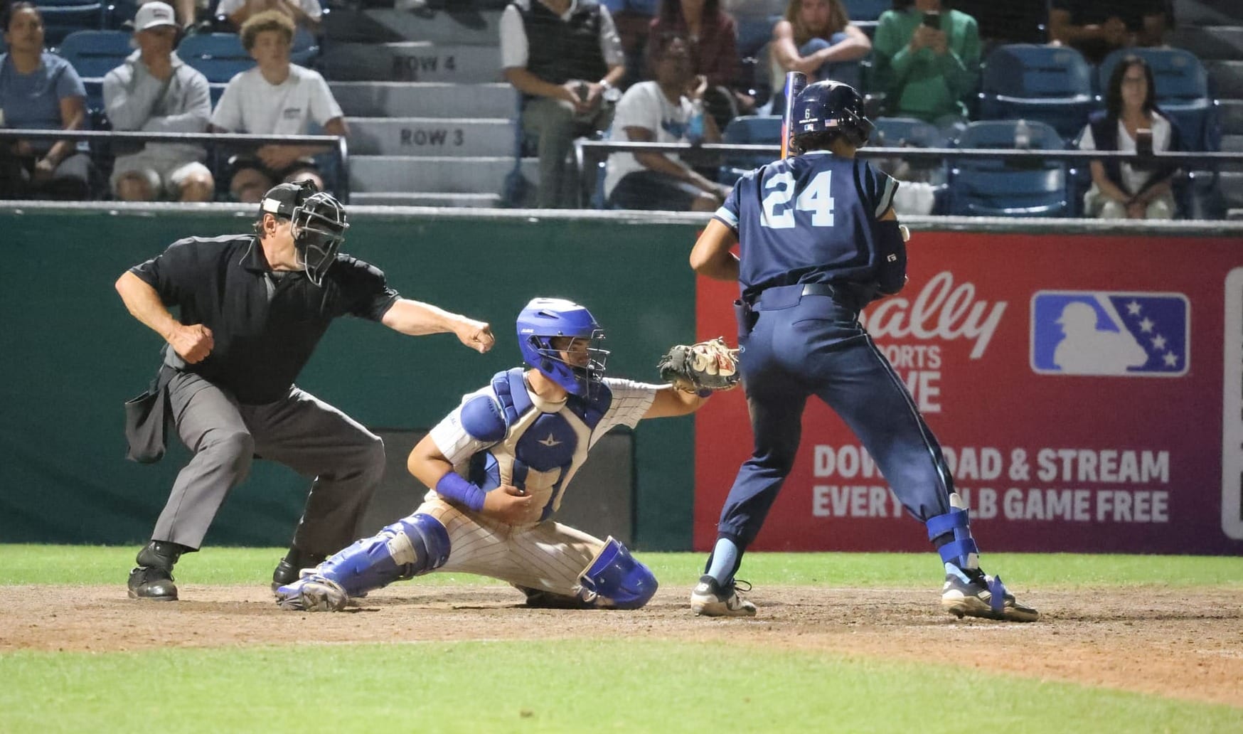 The ball caromed to the left of the first-base dugout, allowing both runners to move into scoring position. Keplinger unsuccessfully argued that the ball went out of play and PJ Bordin, pinch-running for Armstrong, should have been allowed to score, while Harrison advanced to third.